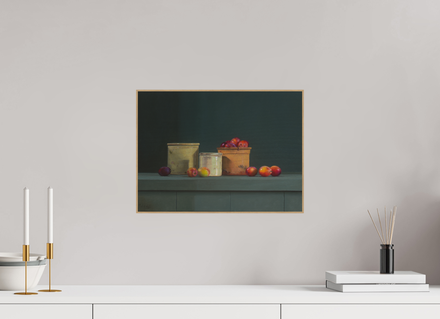 Ripe, full of color, and beautifully balanced. In this realistic still life, Dirk Bal depicts a tranquil arrangement of pots and plums, where the deep green of the background illuminates the rich colors of the fruit.