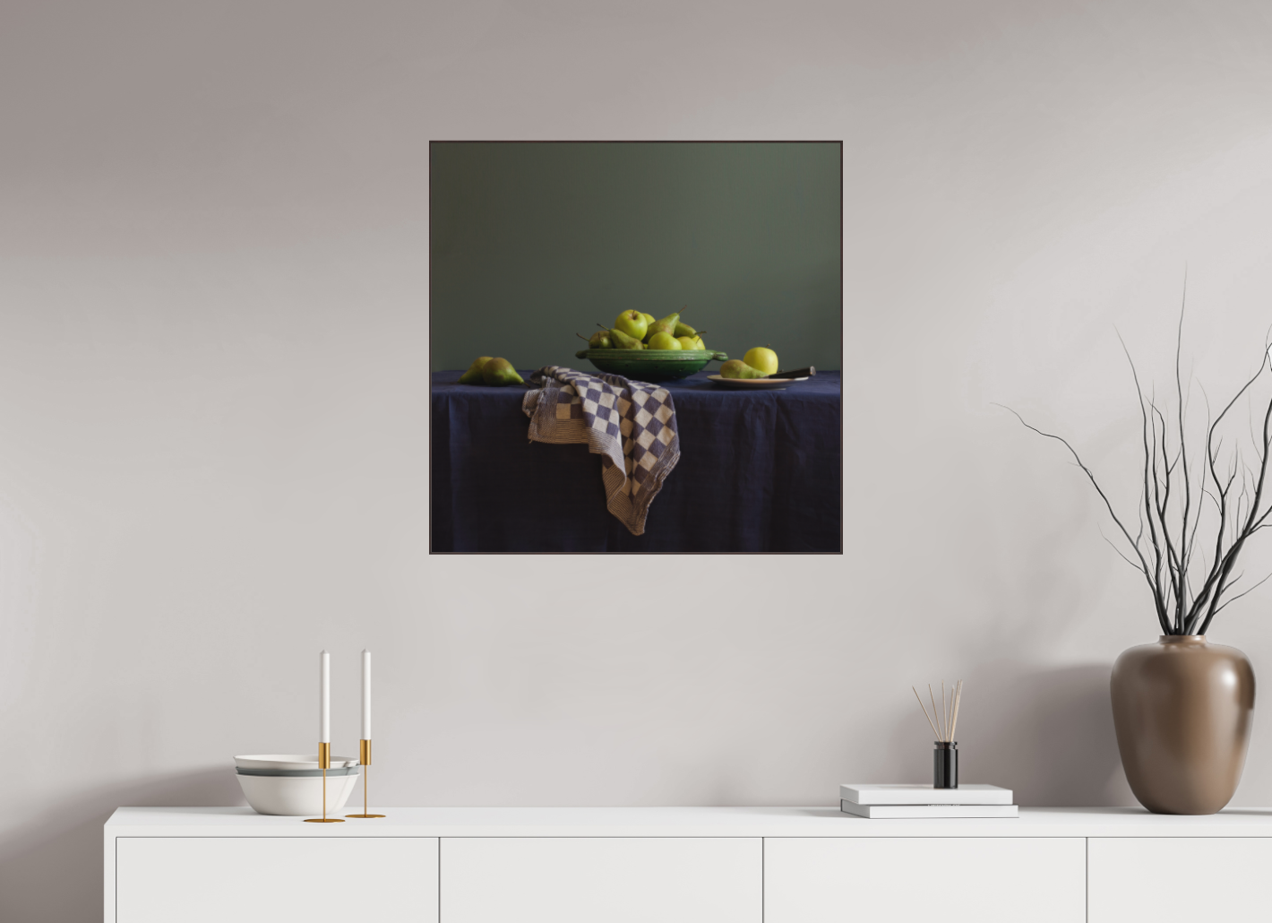 In dit sfeervolle realistisch stilleven brengt Dirk Bal de natuurlijke harmonie van appels en peren tot leven. Een groene schaal vol vers fruit staat centraal, omlijst door een diepblauw tafellaken en een nonchalant gedrapeerd geruit doek. De zachte belichting en ingetogen kleuren creëren een rustieke, tijdloze sfeer.