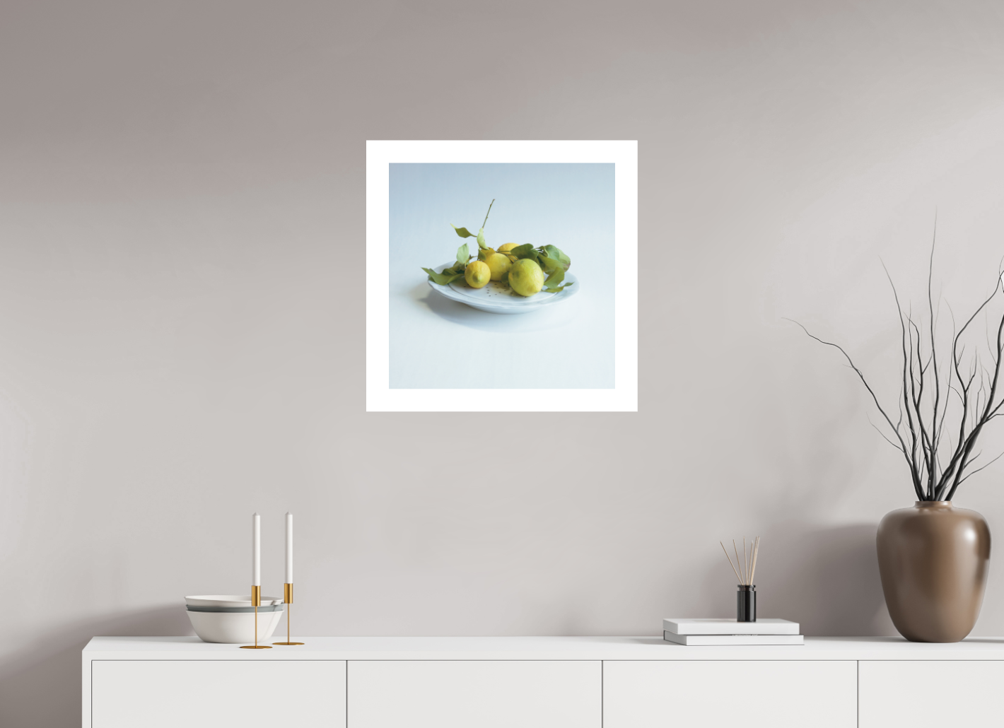 In dit frisse en verfijnde stilleven vangt Dirk Bal de pure schoonheid van biologische citroenen, compleet met blad en tak. De citroenen rusten op een wit keramisch bord, waarbij het zachte licht hun zonnige geel en de natuurlijke groentinten van het blad laat stralen. De minimalistische compositie ademt rust en Mediterrane eenvoud.