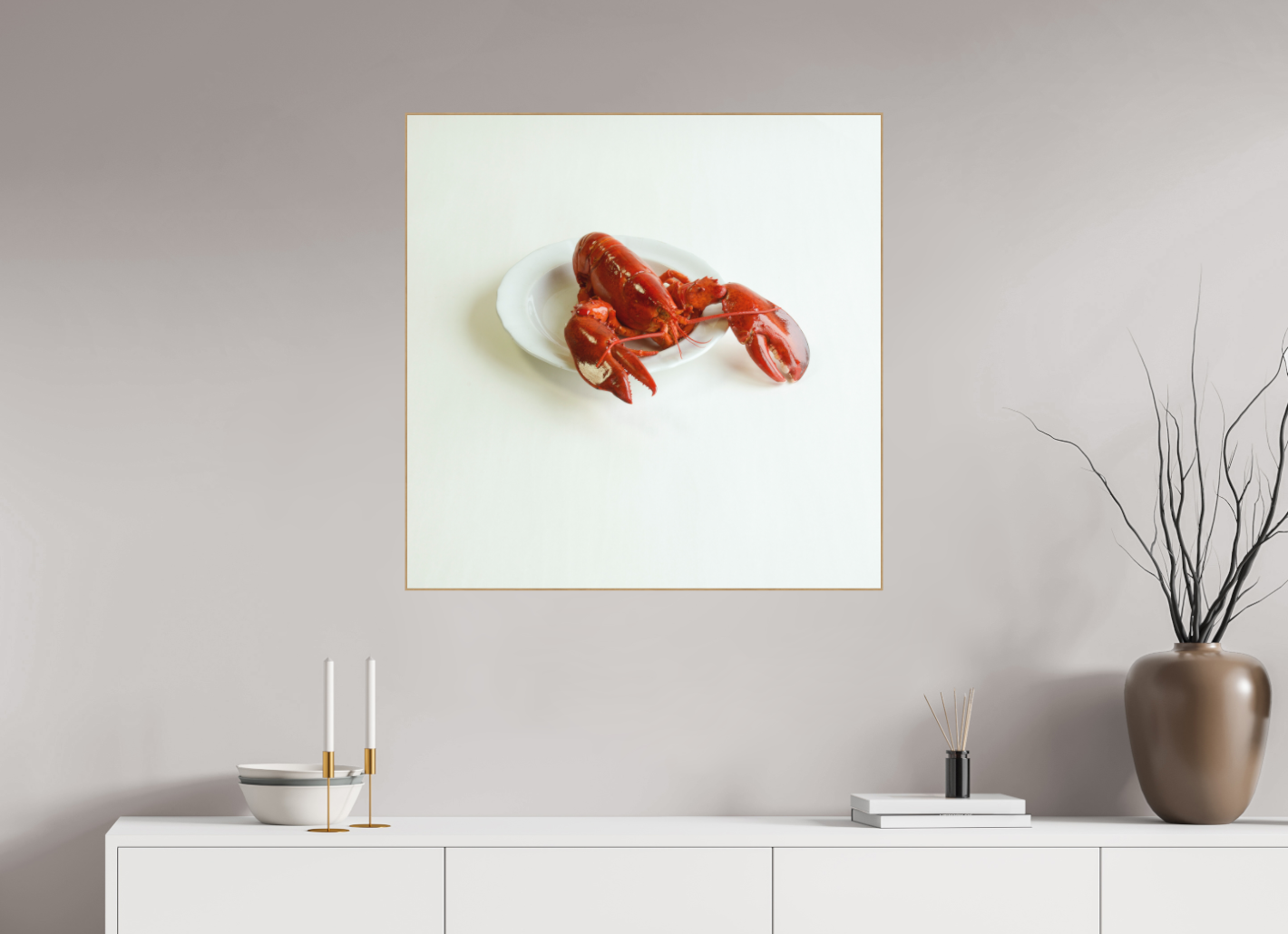 Een iconisch zeewezen, krachtig en verfijnd gepresenteerd op een eenvoudig wit bord. De warme roodtinten van de kreeft contrasteren prachtig met de zachte, lichte achtergrond, waardoor dit realistisch stilleven een bijna sculpturale uitstraling krijgt.