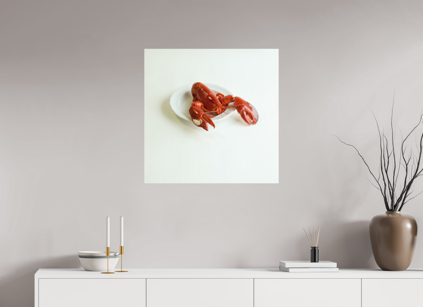 Een iconisch zeewezen, krachtig en verfijnd gepresenteerd op een eenvoudig wit bord. De warme roodtinten van de kreeft contrasteren prachtig met de zachte, lichte achtergrond, waardoor dit realistisch stilleven een bijna sculpturale uitstraling krijgt.