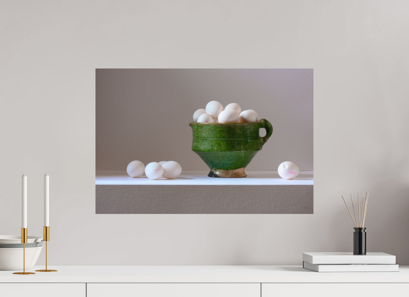 Een eenvoudige, maar rijke compositie: een robuuste, groene aardewerken kom gevuld met witte eieren, enkele speels verspreid op het oppervlak eromheen. Het zachte licht en de subtiele schaduwen geven dit realistisch stilleven een serene, tijdloze uitstraling.