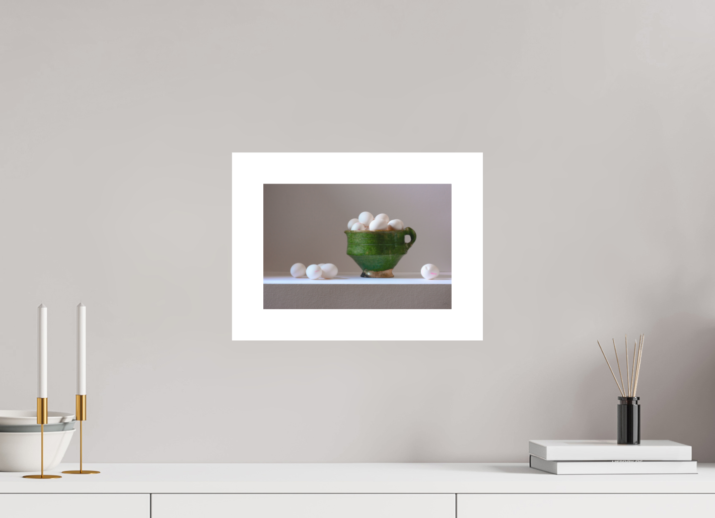 Een eenvoudige, maar rijke compositie: een robuuste, groene aardewerken kom gevuld met witte eieren, enkele speels verspreid op het oppervlak eromheen. Het zachte licht en de subtiele schaduwen geven dit realistisch stilleven een serene, tijdloze uitstraling.