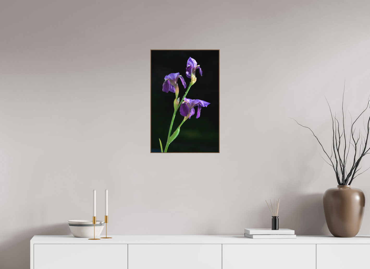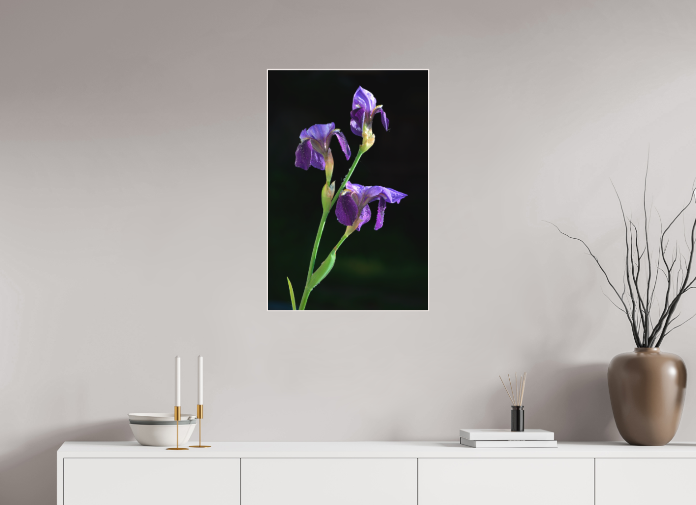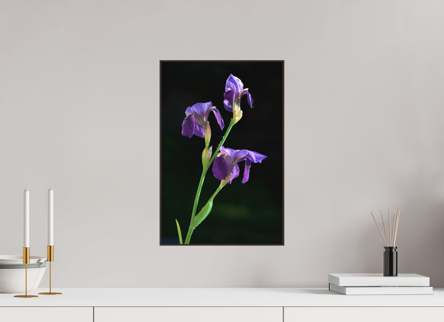 Drie paarse irissen rijzen sierlijk op uit het donker, hun bloemblaadjes subtiel besprenkeld met dauwdruppels. Het diepe paars en het zachte licht creëren een verstilde, bijna schilderachtige sfeer.