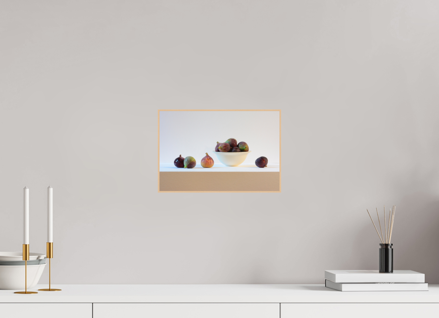 Een stilleven met rijpe vijgen in een elegante witte kom, omringd door losse vruchten op een zachte, lichte achtergrond. De warme paarse en groene tinten van de vijgen contrasteren subtiel met het minimalistische decor, waardoor de natuurlijke schoonheid van het fruit volledig tot zijn recht komt.