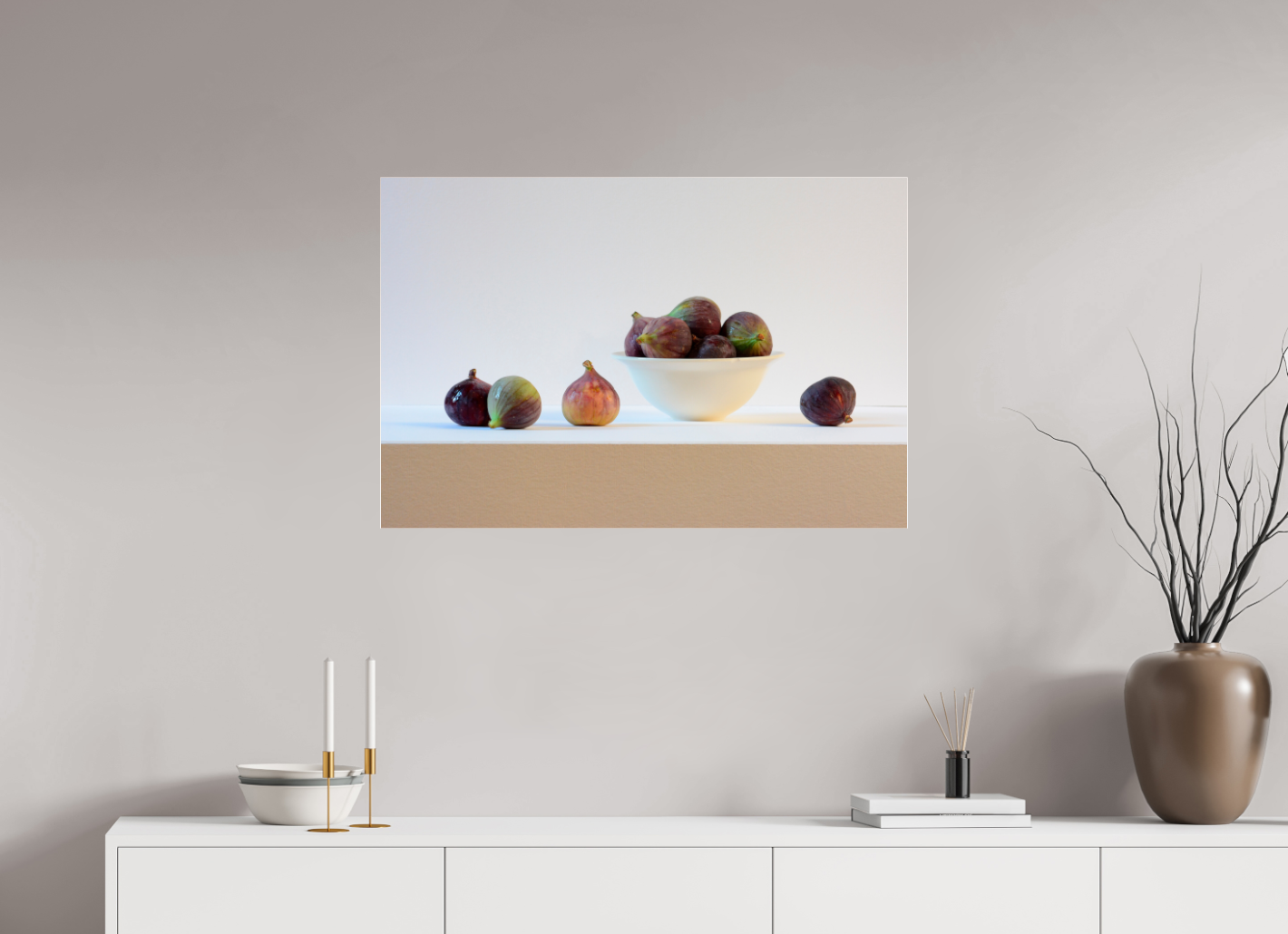 Een stilleven met rijpe vijgen in een elegante witte kom, omringd door losse vruchten op een zachte, lichte achtergrond. De warme paarse en groene tinten van de vijgen contrasteren subtiel met het minimalistische decor, waardoor de natuurlijke schoonheid van het fruit volledig tot zijn recht komt.