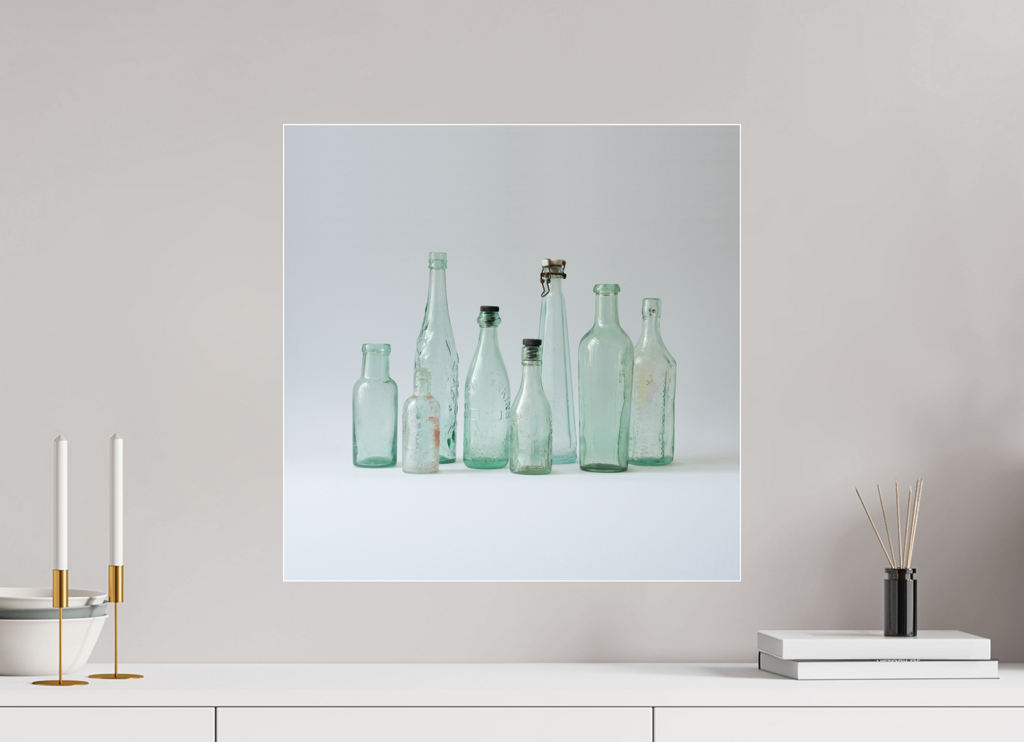 Een speels en verfijnd stilleven waarin oude glazen flessen in uiteenlopende vormen en hoogtes samenkomen. Het zachte groen van het verweerde glas tegen de lichte achtergrond geeft dit werk een frisse, minimalistische uitstraling met een vleug nostalgie.