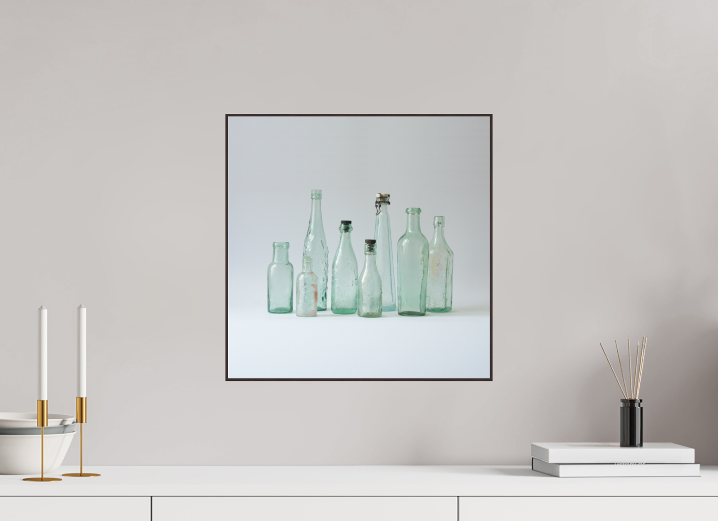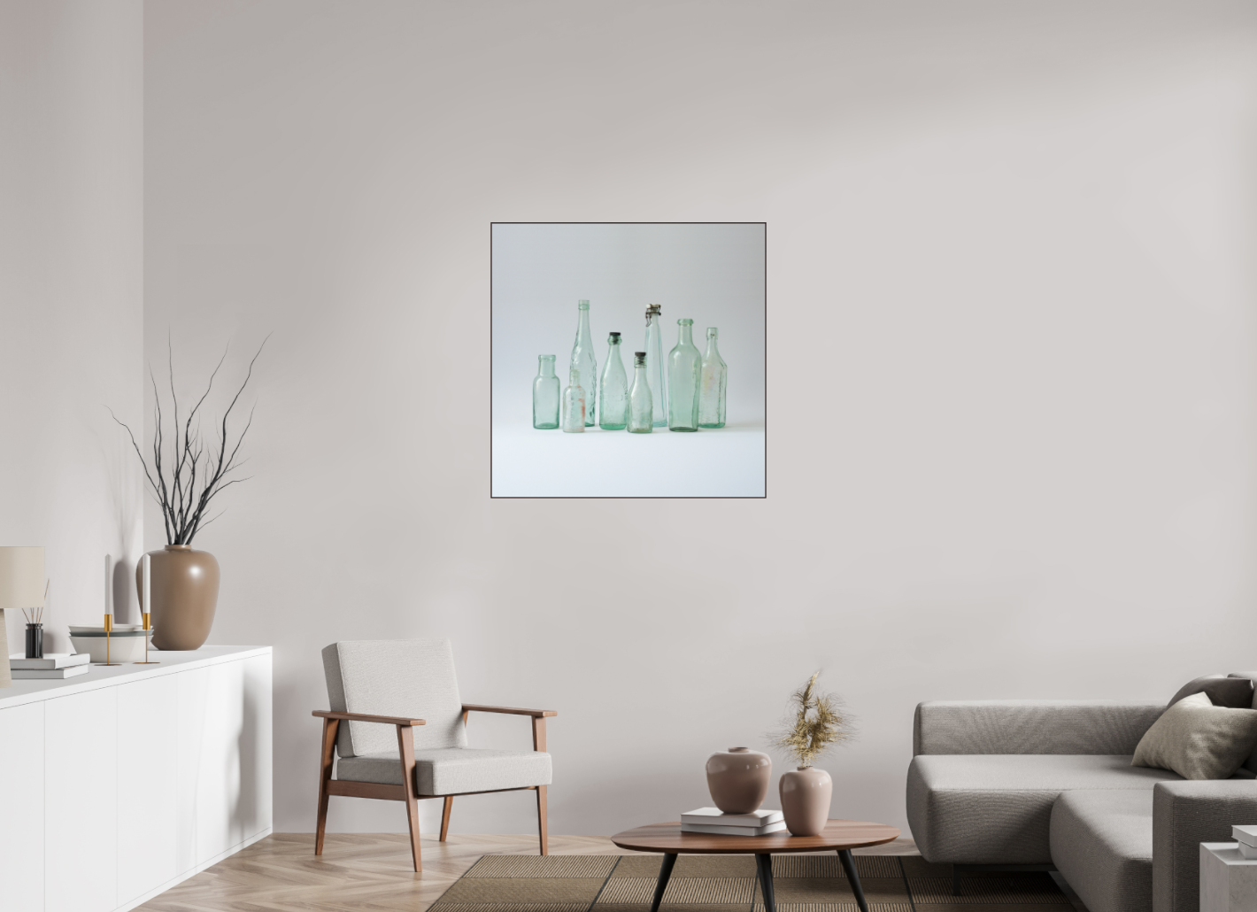 Een speels en verfijnd stilleven waarin oude glazen flessen in uiteenlopende vormen en hoogtes samenkomen. Het zachte groen van het verweerde glas tegen de lichte achtergrond geeft dit werk een frisse, minimalistische uitstraling met een vleug nostalgie.