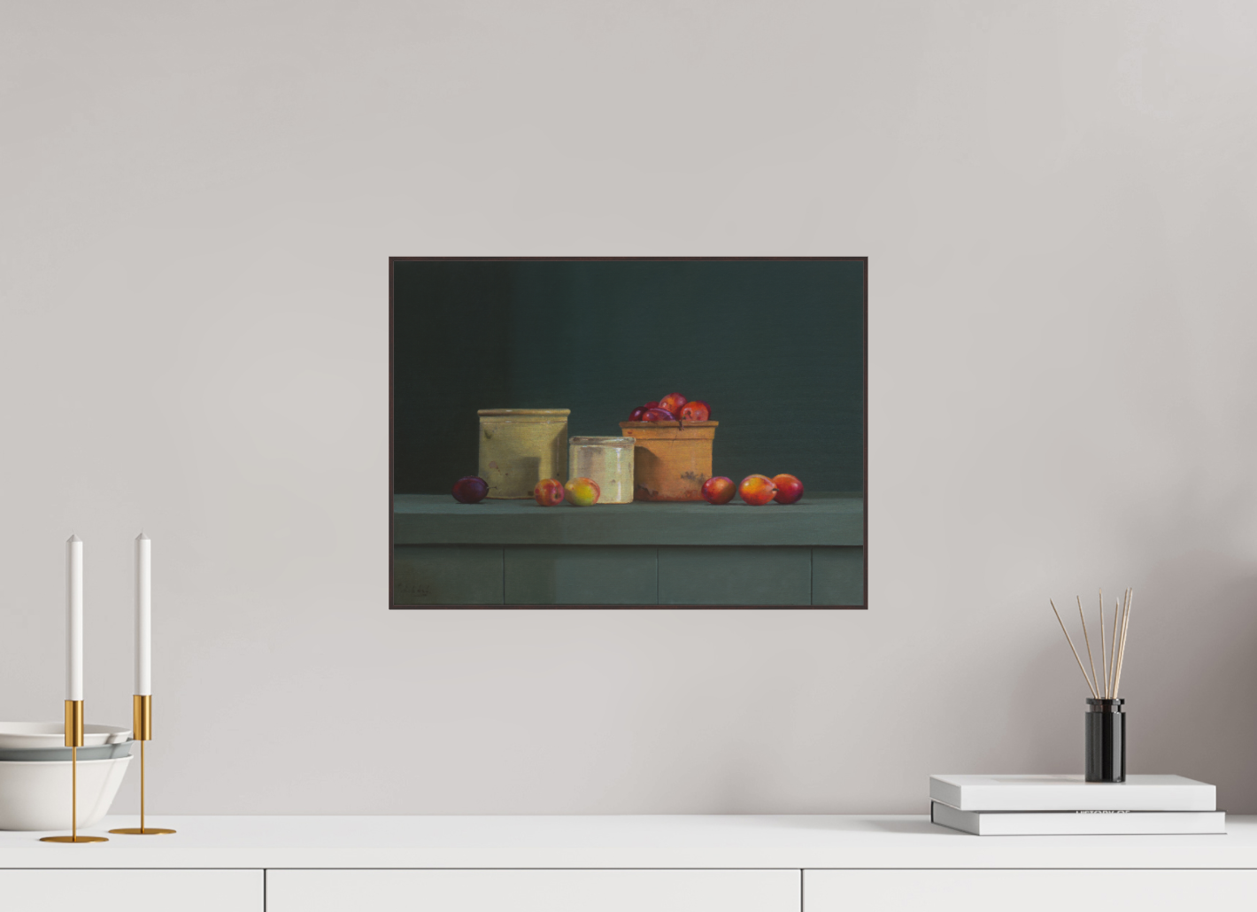 Rijp, vol kleur en prachtig in balans. In dit realistisch stilleven toont Dirk Bal een rustige opstelling van potten en pruimen, waarbij het diepe groen van de achtergrond de rijke kleuren van het fruit doet oplichten.