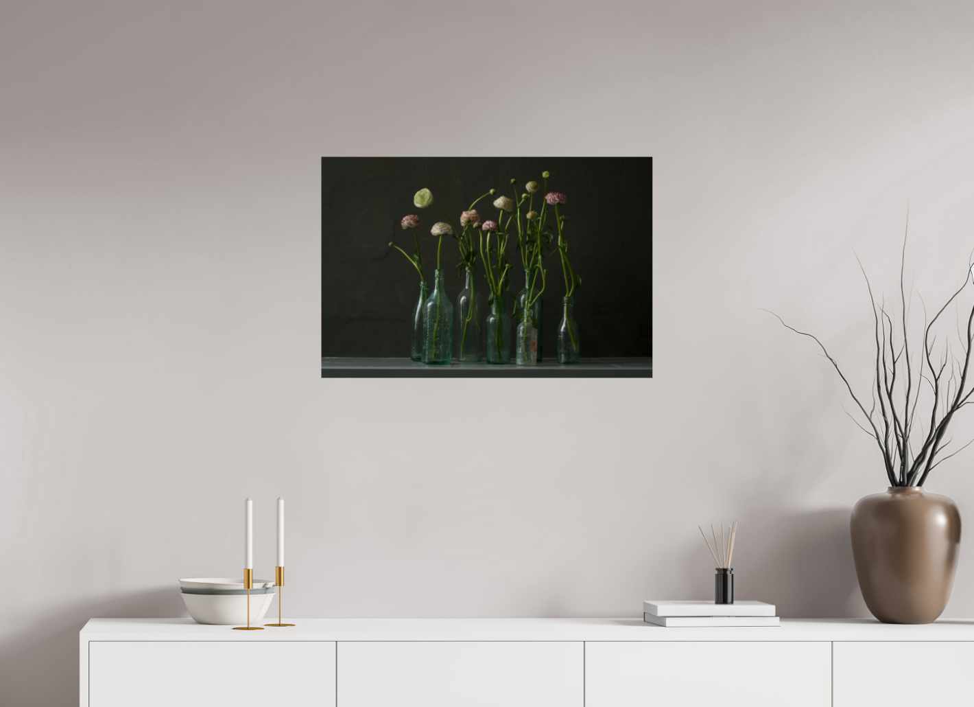 Een verstild moment vol eenvoud en sierlijkheid. In dit realistisch stilleven rangschikt Dirk Bal ranke ranonkels in een reeks karaktervolle glazen flessen — elk uniek in vorm, kleur en lichtreflectie.