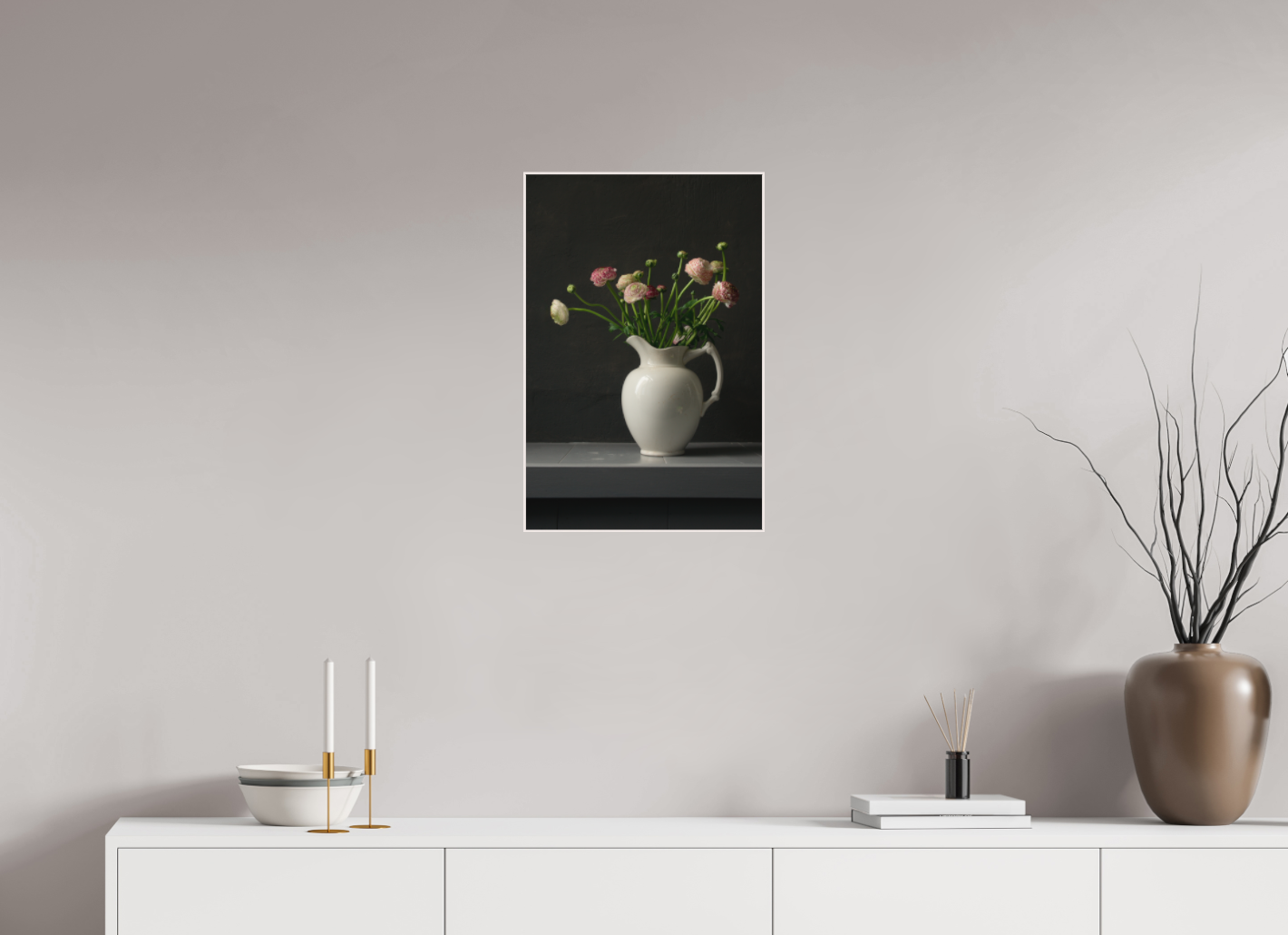 Een stille ode aan eenvoud en schoonheid. In dit realistisch stilleven rust een boeket zachtroze en witgroene ranonkels sierlijk in een klassieke witte kan, tegen een diepe, donkere achtergrond.