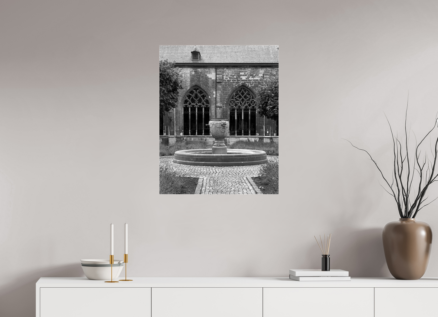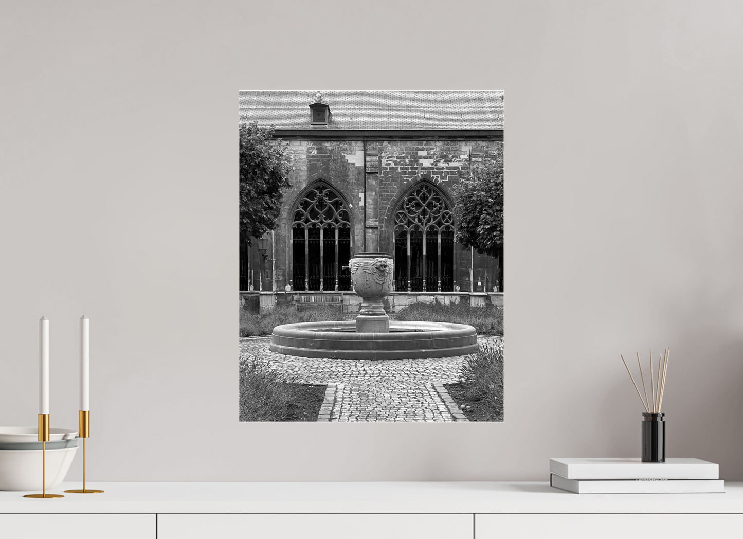 In Sint Servaastuin Maastricht brengt Dirk Bal de serene rust van deze historische kloostertuin tot leven in verfijnd zwart-wit. Het centrale fonteinbassin met zijn gebeeldhouwde leeuwenkop staat symbool voor eeuwigheid en stilte, omlijst door de gotische ramen en verweerde muren van de Sint-Servaasbasiliek.