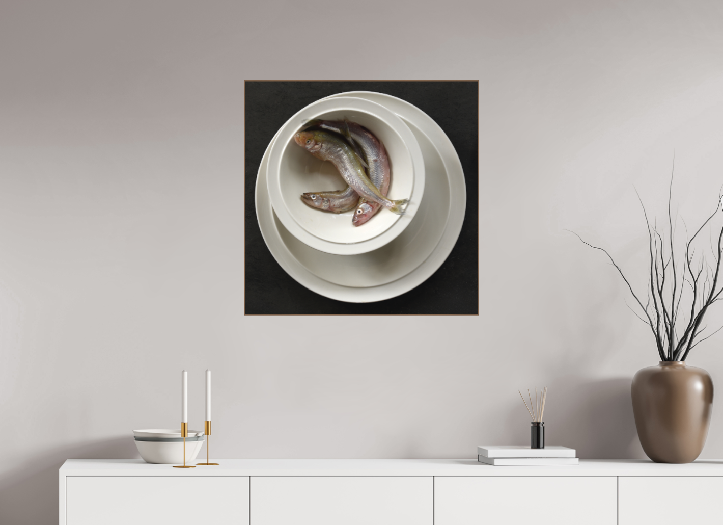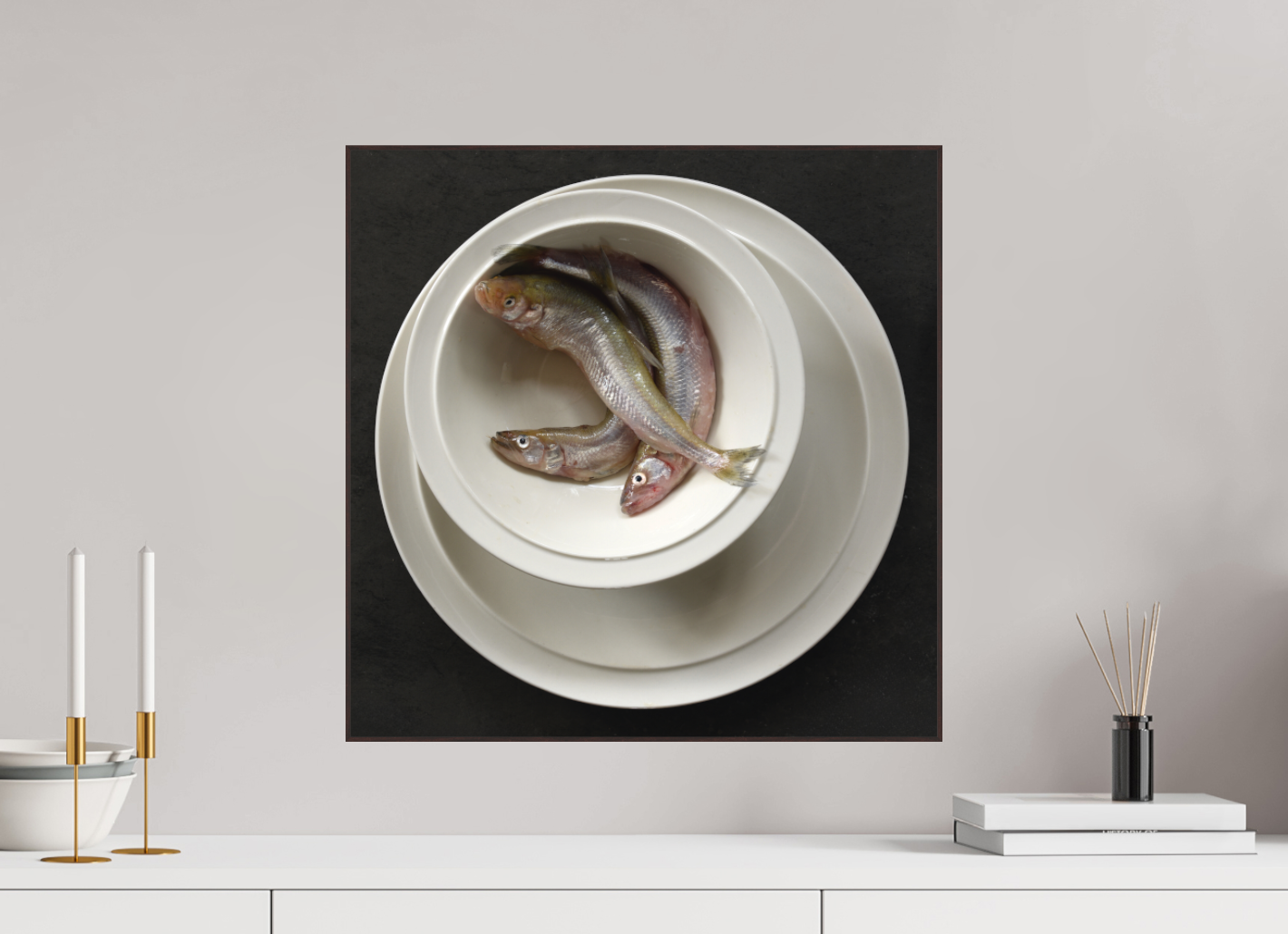Een verstild realistisch stilleven waarin drie zilverglanzende spierinkjes rusten in een strak witte kom, omlijst door perfect ronde schalen. De subtiele glans van de vissen en het spel van licht en schaduw tegen de donkere achtergrond creëren een bijna tastbare sfeer.