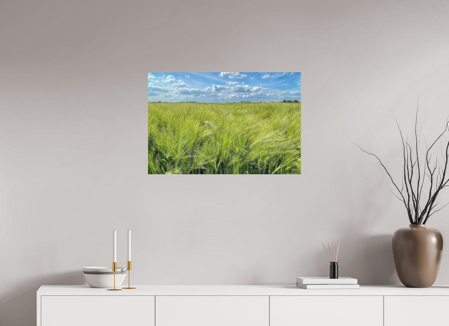 In Wuivend graan vangt Dirk Bal de rustgevende cadans van een zacht bewegend graanveld onder een helderblauwe lucht met witte wolken. De zon verlicht de jonge aren, waardoor het frisse groen een gouden gloed krijgt – een moment van pure zomerse sereniteit.