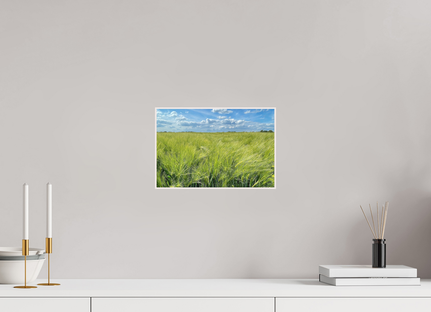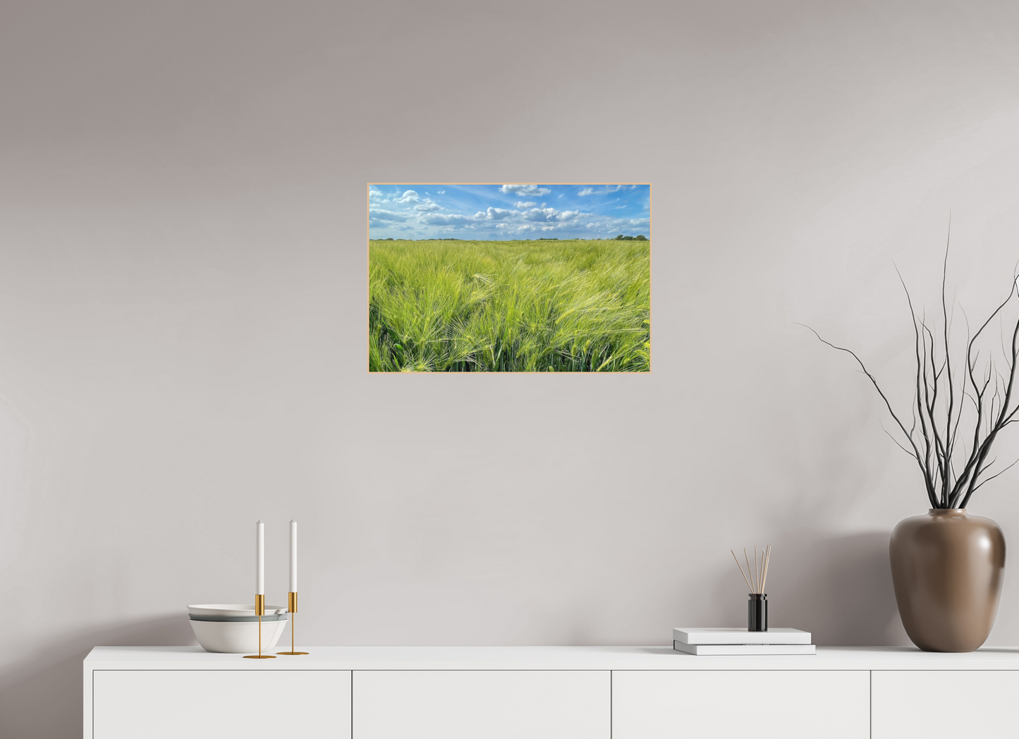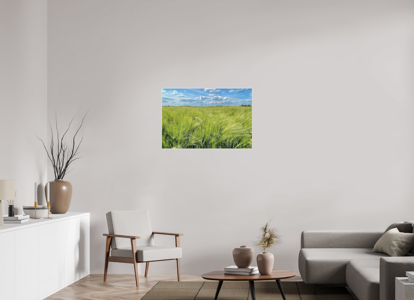 In Wuivend graan vangt Dirk Bal de rustgevende cadans van een zacht bewegend graanveld onder een helderblauwe lucht met witte wolken. De zon verlicht de jonge aren, waardoor het frisse groen een gouden gloed krijgt – een moment van pure zomerse sereniteit.